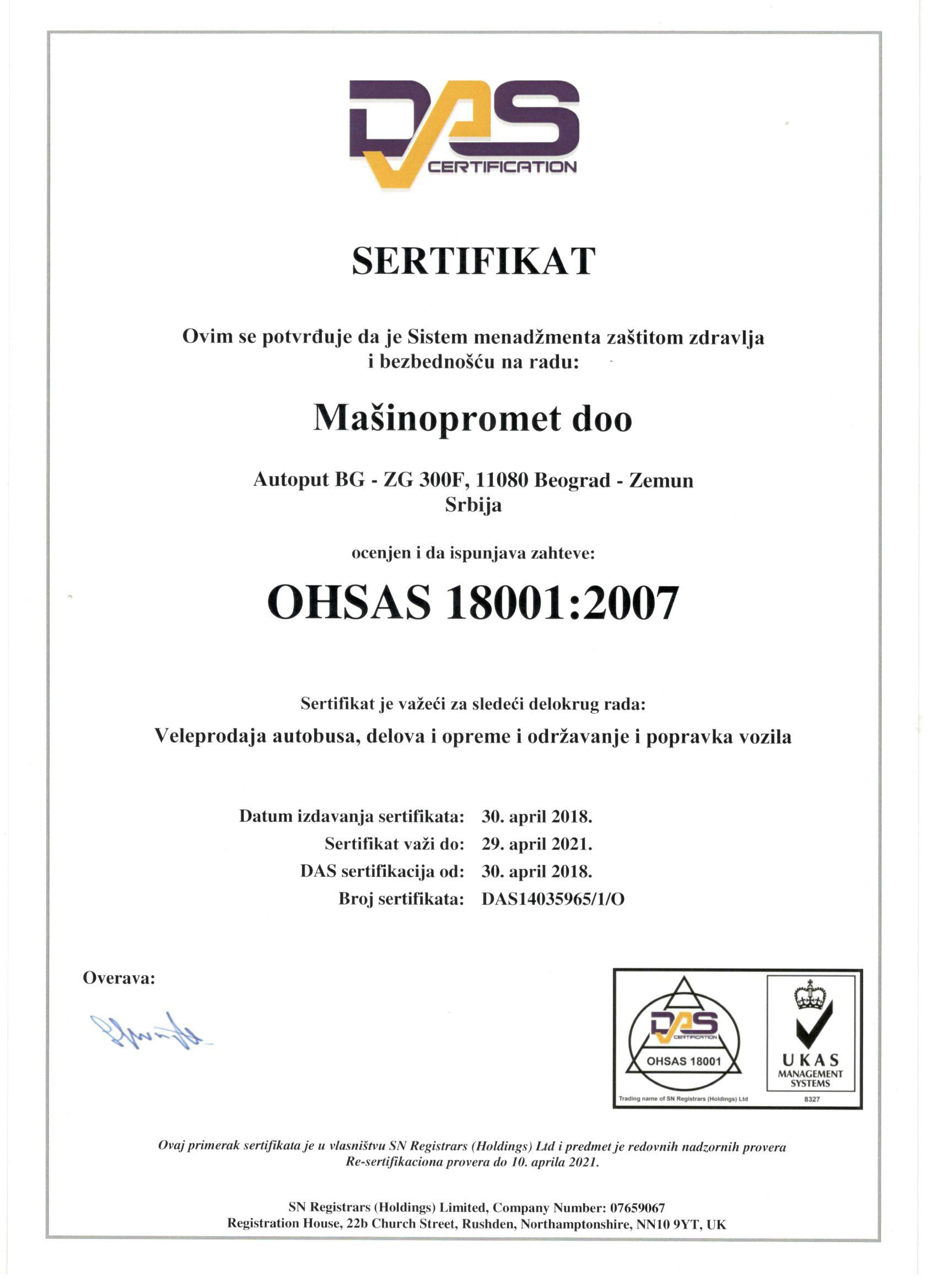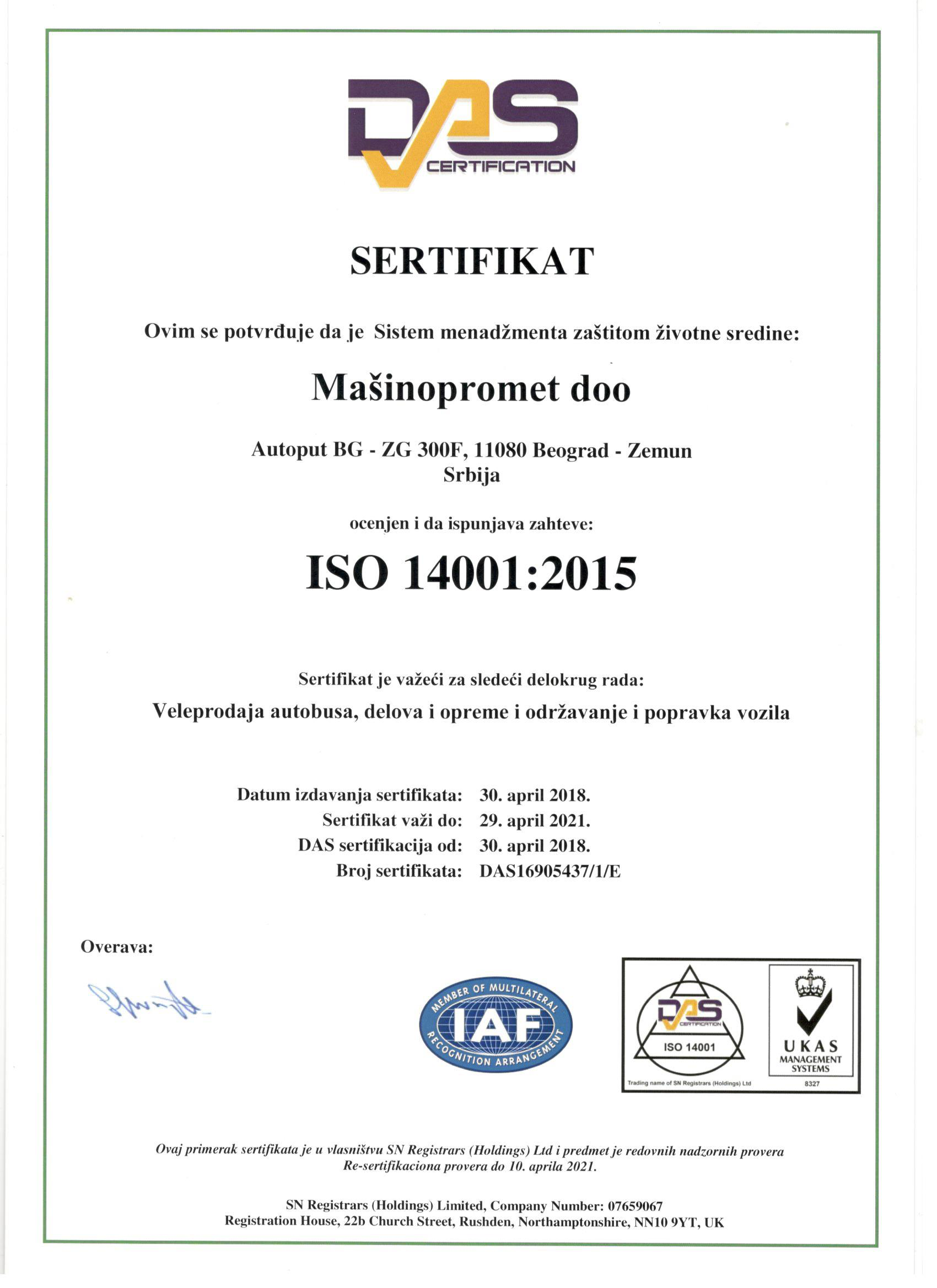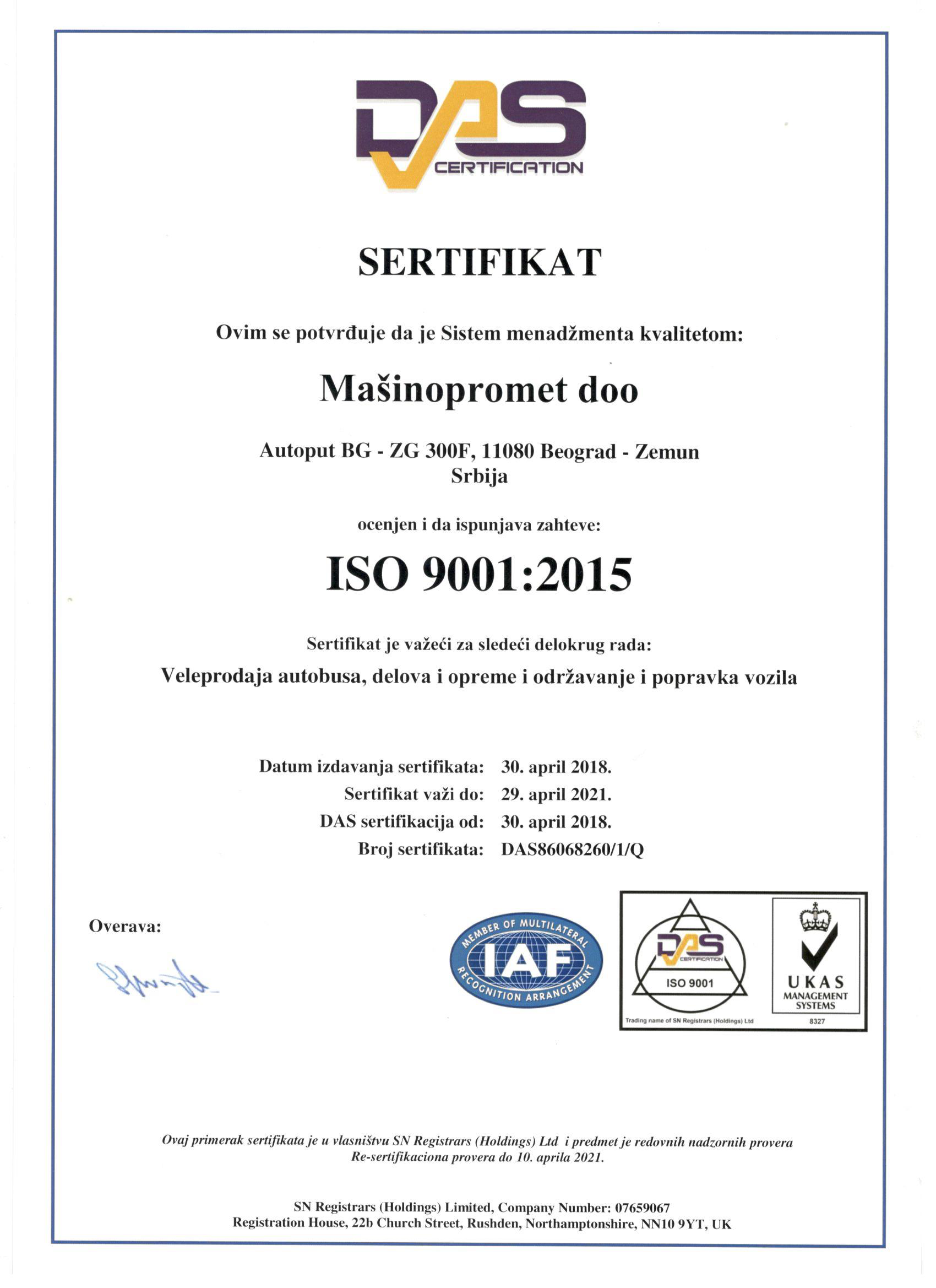 Sertifikati ISO 9001:2015, ISO 14001:2015 i OHSAS 18001:2007 izdati od strane sertifikacionog tela DAS SEE, internacionalno su priznati i u skladu sa zahtevima najpoznatijeg akreditacionog tela UKAS iz Velike Britanije.